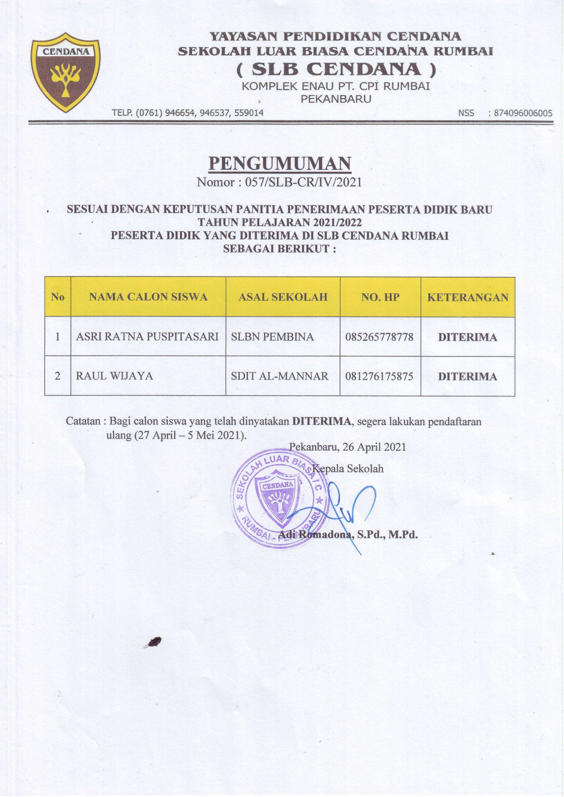 Category: Pengumuman Distrik RumbaiBy Admin YPC RiauSelasa, 27 April 2021Leave a commentShare this post Share on FacebookShare on Facebook Share on XShare on X Pin itShare on Pinterest Share on LinkedInShare on LinkedIn Share on WhatsAppShare on WhatsAppPost navigationPreviousPrevious post:“RAMADHAN PROJECT BERBAGI TAKJIL” APLIKASI NILAI PEDULI SOSIAL EKSKUL ROHIS SMA CENDANA MANDAUNextNext post:Hasil Seleksi PPDB Gelombang I SMP Cendana Mandau Tahun Pelajaran 2021/2022Berita TerkaitHasil Seleksi PPDB Gelombang I Paud Cendana Rumbai Tahun Pelajaran 2021/2022Rabu, 28 April 2021Hasil Seleksi PPDB Gelombang I SMA Cendana Pekanbaru Tahun Pelajaran 2021/2022Rabu, 28 April 2021Hasil Seleksi PPDB Gelombang I SD Cendana Rumbai Tahun Pelajaran 2021/2022Selasa, 27 April 2021